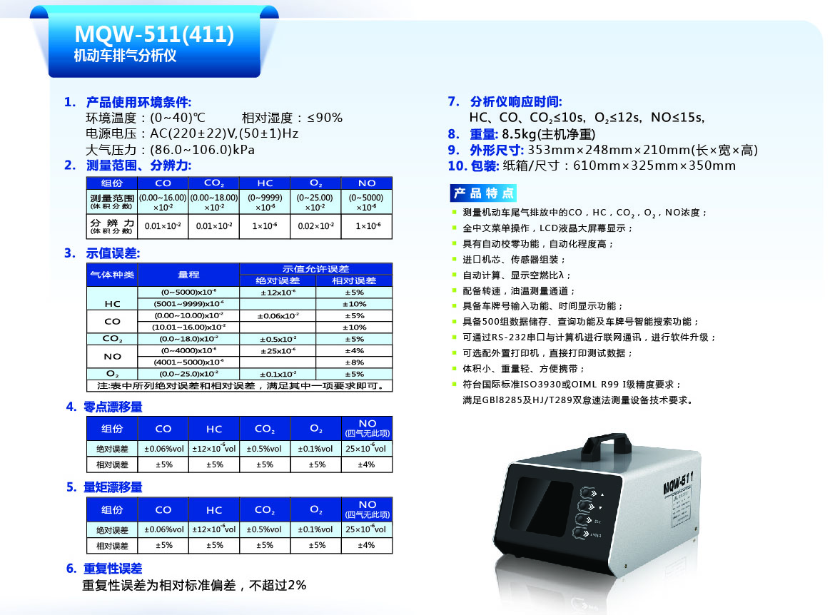 便攜式設(shè)計(jì),符合國標(biāo)ISO 3930和國際OIML R99 0級精度;可多模式雙怠速檢測汽車排氣中的HC、CO、CO2、O2、NO濃度值;高亮度大屏幕液晶顯示,按鍵/菜單對應(yīng)式一鍵引導(dǎo)操作;可進(jìn)行天然氣(CNG)、液化氣(LPG)、乙醇等多燃料車輛檢測;具備車牌號輸入/時間顯示和700組數(shù)據(jù)信息存儲??蛇M(jìn)行U盤數(shù)據(jù)移動存儲和適時的數(shù)據(jù)通訊傳輸功能;標(biāo)配感應(yīng)式轉(zhuǎn)速測量鉗;具備3分鐘預(yù)熱快速測量功能。